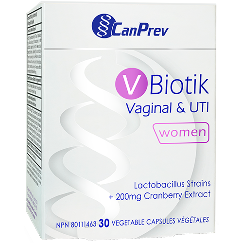 A healthy vaginal microbiome needs a diverse group of bacteria to thrive. But factors like stress and hormonal fluctuations can get in the way of maintaining balance. CanPrev’s V-Biotik Vaginal & UTI formula combines two Lactobacillus strains with added cranberry extract to help restore healthy vaginal flora and prevent UTIs.