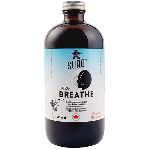 SUROBREATHE by SURO is a powerful liquid blend of 17 organic herbs designed to help clear congestion. Provides natural relief from chest congestion and seasonal allergies. Feel the difference. Breathe freely … naturally. Includes herbs such as marshmallow root, plantain, eucalyptus, mullein, nettle, elderflowers and more. Certified Organic and made in Canada.